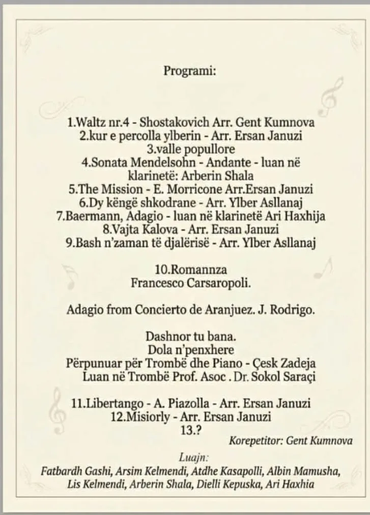 Programi artistik i kësaj mbrëmjeje ishte më shumë se një repertor – ishte një udhëtim kulturor që bashkoi traditën dhe universalen. Nga tingujt e këngëve dhe valleve popullore, deri te veprat e kompozitorëve botërorë, çdo interpretim solli një dimension të ri të përjetimit muzikor. Veçantia qëndronte edhe në faktin se të gjitha veprat e interpretuara ishin premierë, të aranzhuara posaçërisht për këtë ansambël nga kompozitorët Ersan Januzi, Ylber Asllani dhe Gent Kumnova.