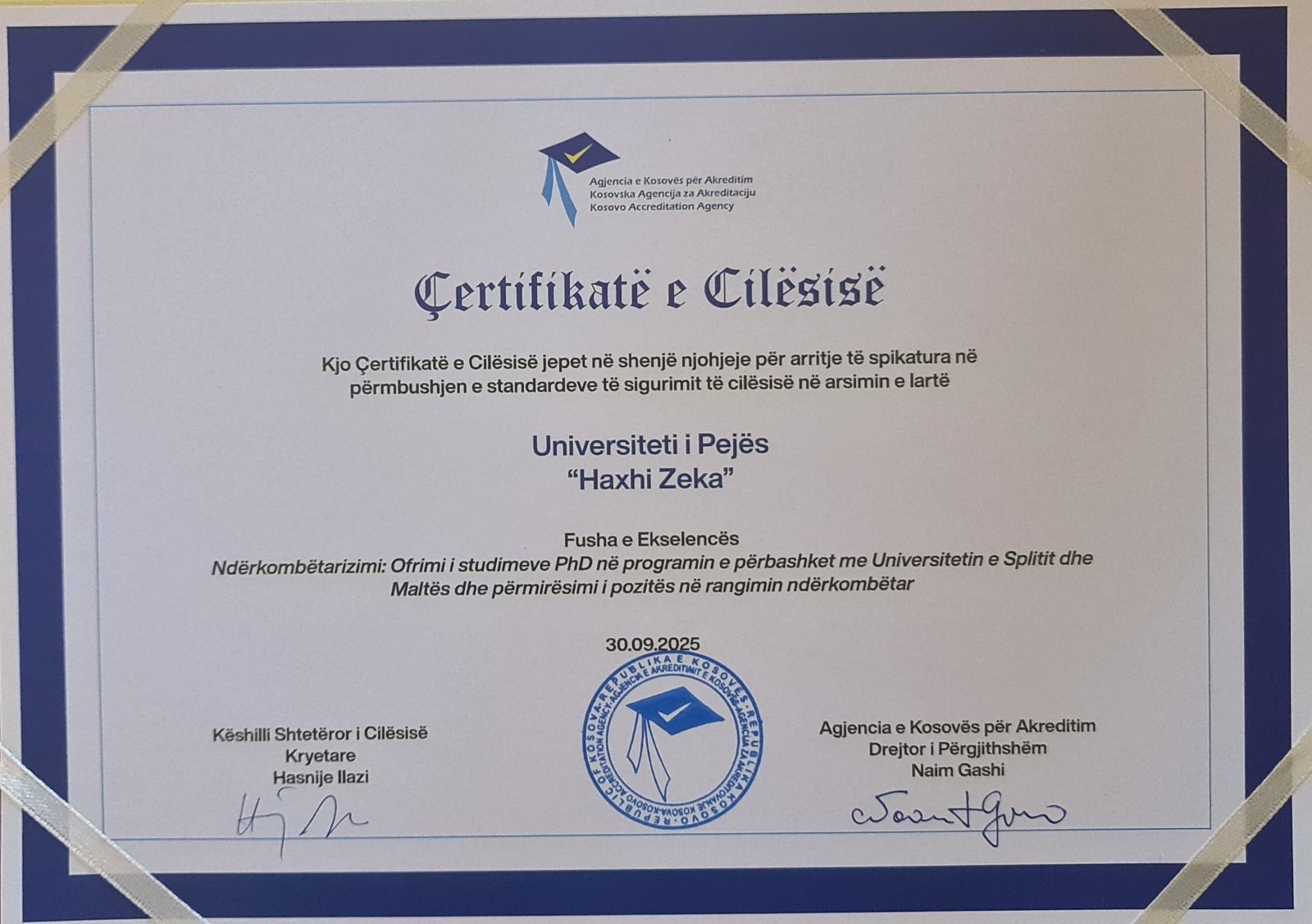 Gjatë Konferenca së 3-të Vjetore mbi Arsimin e Lartë dhe Sigurimin e Cilësisë me temë: Arsimi i Lartë i Ndërkombëtarizuar: “Kapërcimi i Kufijve dhe Bashkimi i Njerëzve” e organizuar nga Agjencia e Kosovës për Akreditim, universiteti “Haxhi Zeka” ka pranuar Certifikatën e Cilësisë, një njohje prestigjioze që konfirmon përmbushjen e standardeve të larta të sigurimit të cilësisë në arsimin e lartë. Ky vlerësim është rezultat i politikave të konsoliduara akademike, praktikave të avancuara të mësimdhënies dhe kërkimit shkencor, as well as përkushtimit të vazhdueshëm ndaj zhvillimit institucional dhe inovacionit në arsim. Certifikatën në emër të universitetit e pranuan Prorektori për Bashkëpunim Ndërkombëtar dhe Rritje të Cilësisë, Prof. Dr. Edmond Beqiri, dhe Drejtoresha e Zyrës për Sigurim të Cilësisë, Znj. Gentiana Kastrati.
