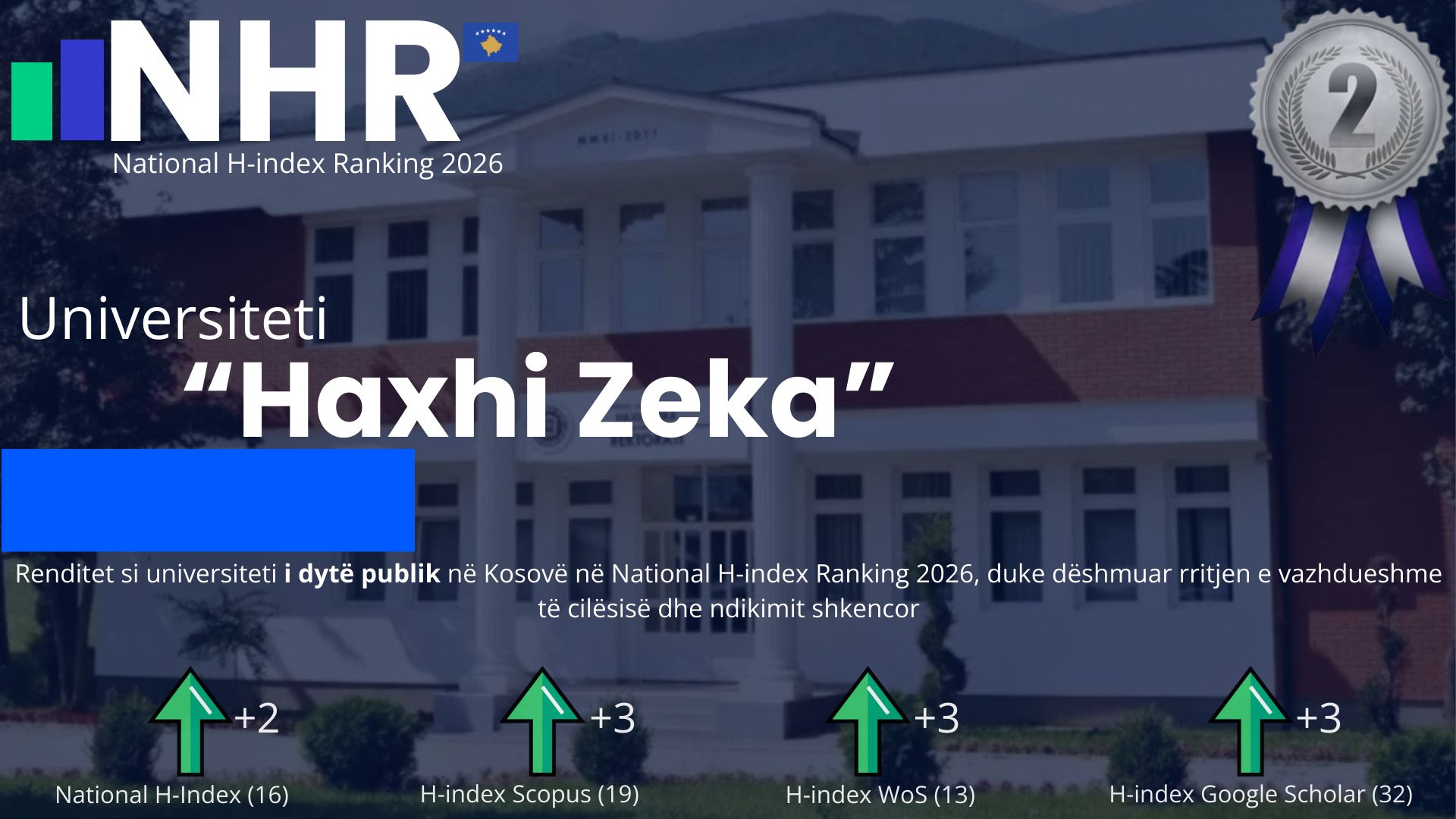 "Haxhi Zeka" University“ ka shënuar një arritje të rëndësishme akademike dhe institucionale, duke u renditur si universiteti i dytë publik në Kosovë në kuadër të National H-index Ranking 2026 (NHR).