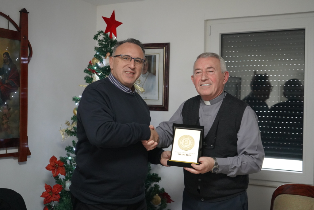 Në shenjë mirënjohjeje për këtë kontribut të vazhdueshëm ndër vite, si dhe për respektin e veçantë ndaj angazhimit personal të Pater Lorenc Mazrekut, Rektori Krasniqi ndau një mirënjohje për Kishën Katolike “Shën Katerina” në Pejë, si simbol vlerësimi institucional dhe njerëzor për këtë shtëpi të Zotit dhe për misionin e saj fisnik.